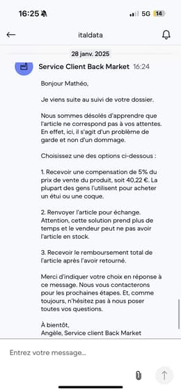 Θα ήθελα να εκφράσω τη δυσαρέσκειά μου και να σας προειδοποιήσω να μην αγοράσετε από την Back Market. Αγοράζετε από μεταπωλητές και η Back Market δεν διστάζει να πει ψέματα για τους χρόνους παράδοσης. Στην περίπτωσή μου, με παραπλάνησαν σχετικά με την ημερομηνία παράδοσης. Όταν τελικά παρέλαβα το δέμα μου, ήταν σπασμένο. Μετά από πολυάριθμες συζητήσεις με την υπηρεσία εξυπηρέτησης μετά την πώληση, οι οποίες φυσικά δεν κατέληξαν σε τίποτα, συνειδητοποίησα ότι υπερασπίζονταν πάνω απ' όλα τον έμπορο λιανικής πώλησης. Πρέπει να επισημάνω ότι το σπάσιμο δεν οφειλόταν στη μεταφορά, αλλά στον λιανοπωλητή που το είχε στείλει σε αυτή την κατάσταση. Είχα αγοράσει ένα MacBook αξίας 800 ευρώ, και η διαδικασία διήρκεσε πάνω από ένα μήνα. Κατά τη διάρκεια αυτής της περιόδου, έμεινα στο σκοτάδι, χωρίς καμία πραγματική πληροφόρηση. Αντιμέτωπη με αυτό το πρόβλημα, η υπηρεσία εξυπηρέτησης μετά την πώληση μου πρότεινε διάφορες λύσεις: - Ένα κουπόνι 5%, υποτίθεται για να αγοράσω προστασία για το MacBook. Με άλλα λόγια, για έναν υπολογιστή αξίας 800 ευρώ, μου έδιναν 5% για να το βουλώσω και να αγοράσω μια θήκη. Αρκεί να πω ότι βρήκα αυτή την πρόταση γελοία. - Επιστροφή του MacBook για αντικατάσταση. Ωστόσο, ο χρόνος αναμονής δεν ήταν εγγυημένος, καθώς ο έμπορος λιανικής μπορεί να μην είχε τα απαραίτητα ανταλλακτικά ή ακόμη και ένα ανταλλακτικό MacBook. Με άλλα λόγια, η ανταλλαγή θα μπορούσε να διαρκέσει απροσδιόριστο χρονικό διάστημα... για ένα προϊόν που κοστίζει 800 ευρώ! Πολύ επαγγελματικό, έτσι δεν είναι; Εν κατακλείδι, σας συμβουλεύω να μην αγοράζετε από το Back Market. Οι υπηρεσίες τους είναι ανυπόληπτες, η εξυπηρέτηση πελατών τους θλιβερή και θα ήταν καλύτερα να φυλάξετε τα χρήματά σας για μια πιο αξιόπιστη αγορά.